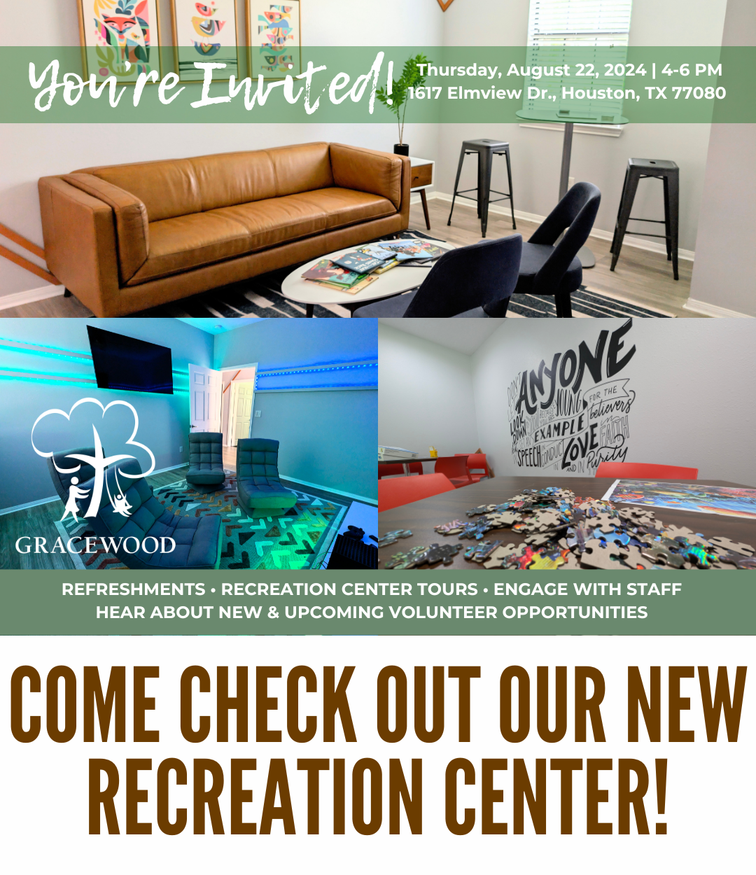 I wanted to invite you to join us at Gracewood on Thursday, August 22nd at any time from 4 - 6pm so I can meet you in person, talk about some new and upcoming volunteer opportunities, as well as show off our new Recreation Center!