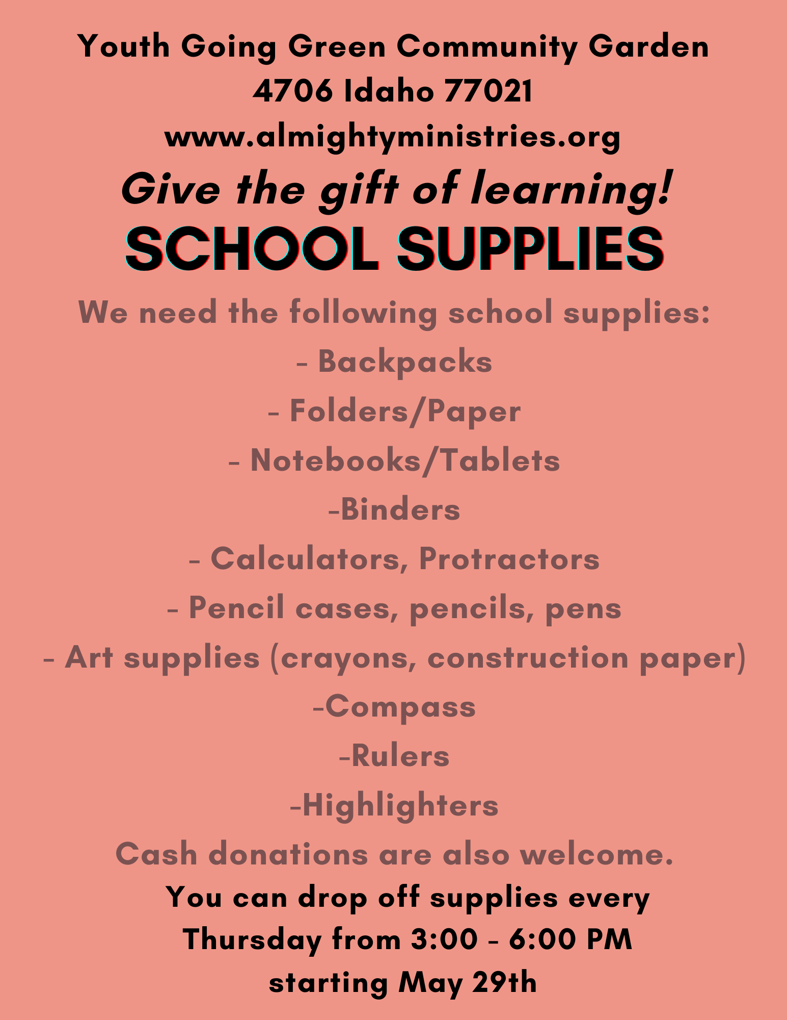School supplies are being accepted at the Youth Going Green Community Garden, 4706 Idaho, Houston, TX 77021. Cash donations can be sent through Zelle. Please see attached flyer for a listing of school supplies needed.