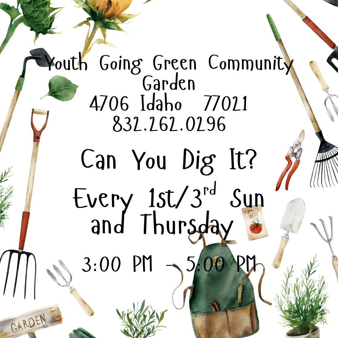 Volunteers are needed to plant, pull weeds, lay mulch, paint, repair fence/garden tools, and assemble a compost bin. Youth Going Green Community Garden, 4706 Idaho St 77021