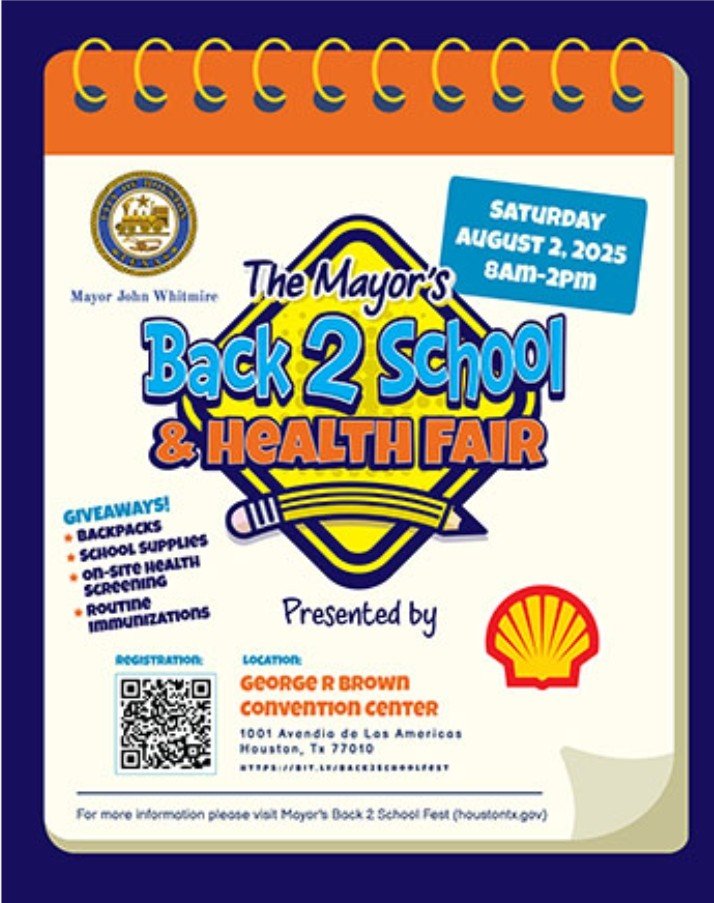 Join Mayor John Whitmire and the City of Houston in giving Houston students a strong start to the school year! We are looking for enthusiastic volunteers to help at the Mayor's Back to School Fest presented by Shell. Thousands of families will receive free school supplies, health screenings, and valuable resources.
