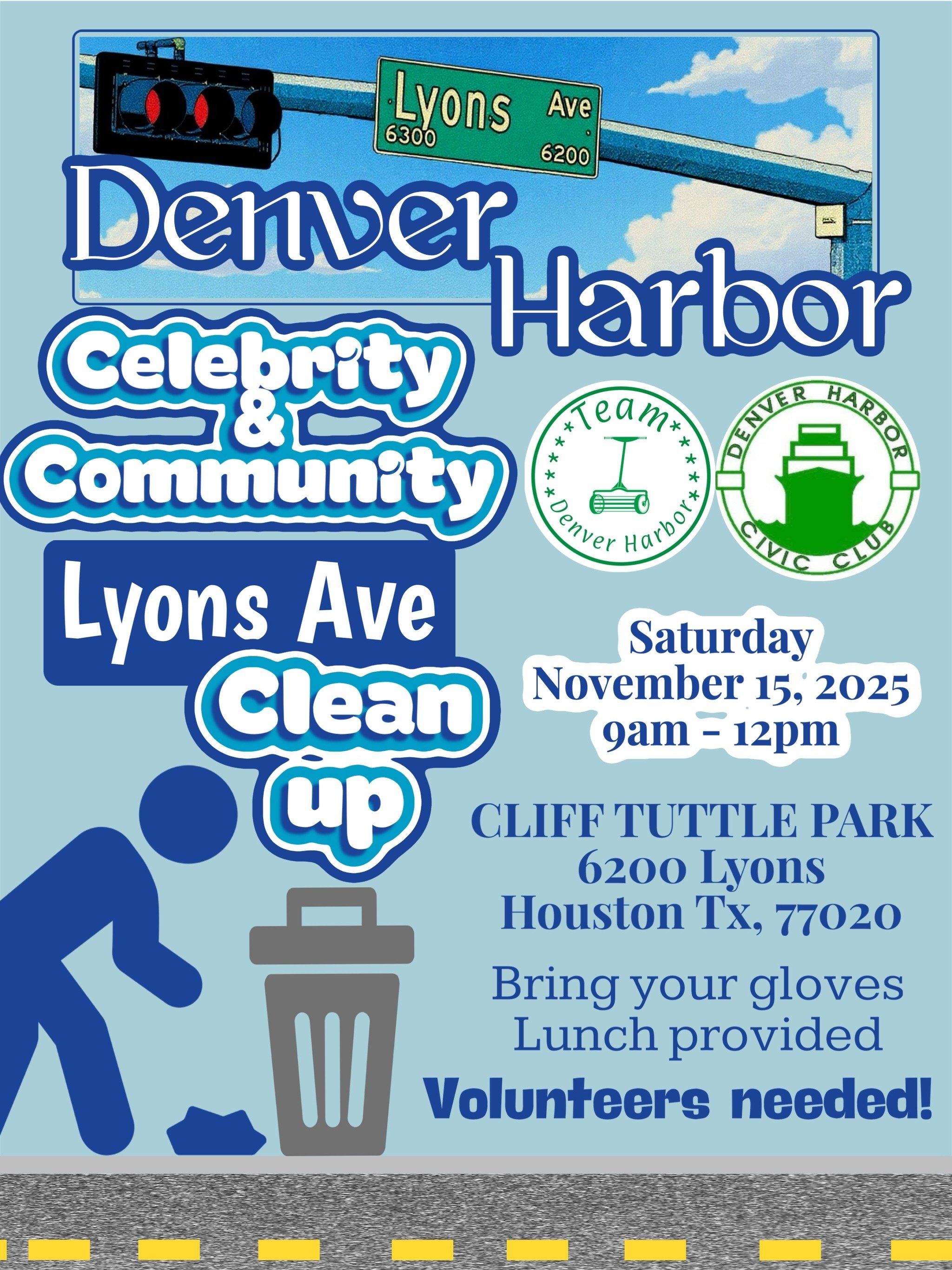 The Department of Neighborhoods is seeking dedicated volunteers to help assist with the Denver Harbor Celebrity and Community Clean up at Cliff Tuttle Park on Saturday, November 15th, 2025 from 9am-12pm.