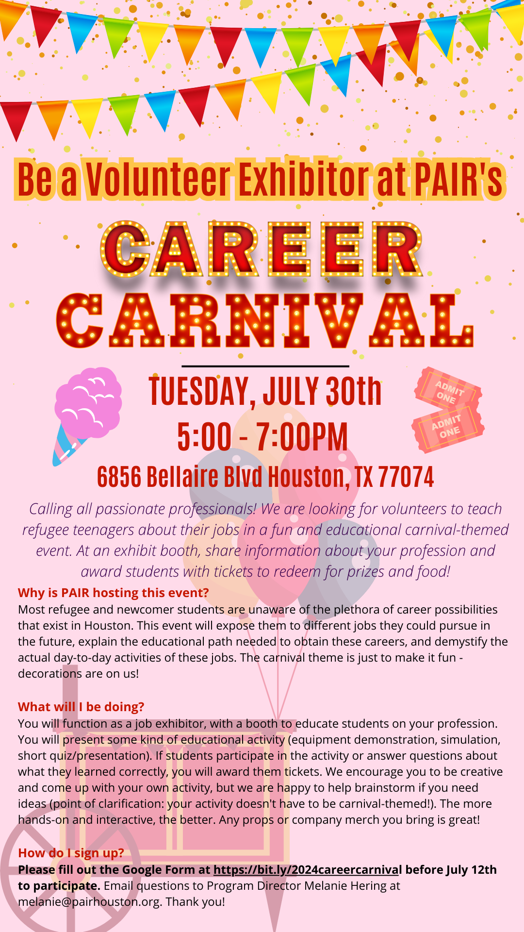 PAIR's second annual Career Carnival is an event exposing refugee and newcomer students to the plethora of Houston career possibilities in a fun, interactive way! The event will feature exhibit booths run by different professionals who will share about their jobs and lead short activities with our students to help them learn more about different jobs they could have in the future.