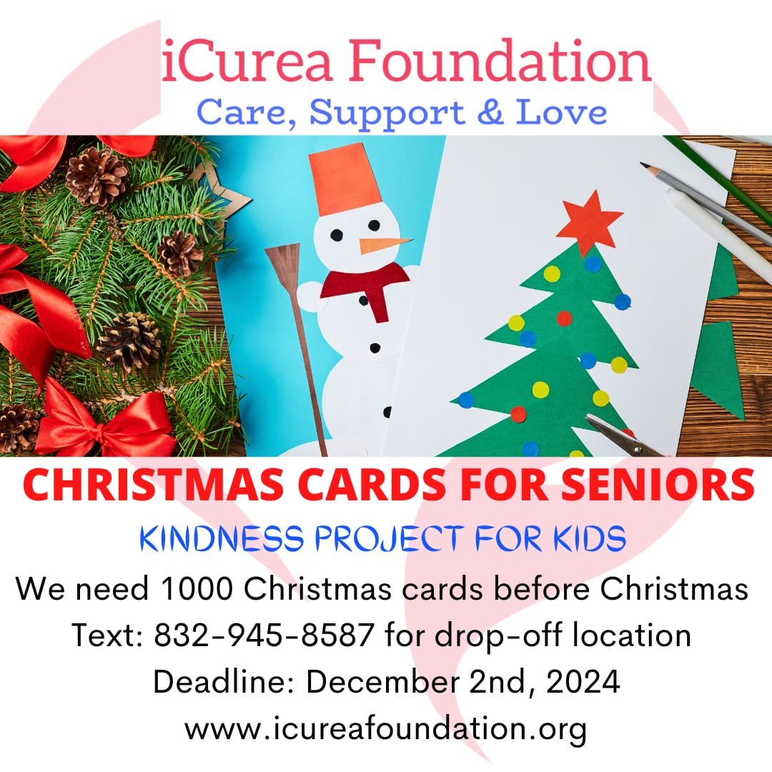 iCurea Foundation Kindness Project for Kids- collects handmade/store bought Christmas cards for seniors in low-income nursing homes. Let your children/class to participate in this project. Please send us a message for drop off location.